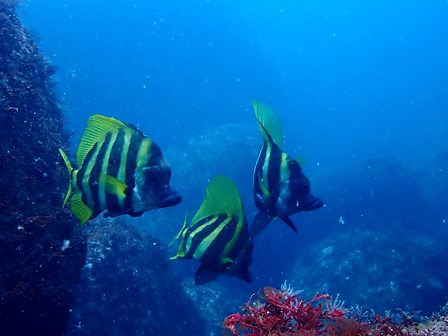 生物:イシダイ・テングダイ・ハナミノカサゴ・キタマクラyg・イワシの群れ・キビナゴの群れ・シマアジygの群れ・キンメモドキの群れ・サッパの群れ・アジygの群れ・ムツygの群れ・ツマグロハンポの群れ・ゴンズイの群れ・イシガキフグの群れ・イッセンタカサゴの群れ・シラコダイの群れ・クロホシイシモチの群れ・イスズミの群れ・ニザダイの群れ・キンギョハナダイの群れ 他