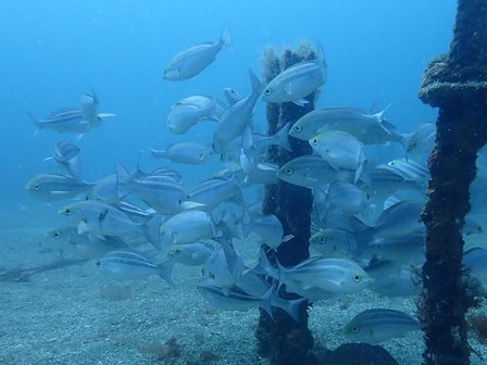 生物:ハンマーヘッドシャーク・オオモンカエルアンコウ・イロカエルアンコウ・コクテンハギ・トゲダルマガレイ・イシガキダイ・カンパチの群れ・コロダイの群れ・イサキの群れ・メジナの群れ・イスズミの群れ・ホウライヒメジの群れ・キンメモドキの群れ・キビナゴの群れ・ツマグロハンポの群れ・イシガキフグの群れ・イッセンタカサゴの群れ・クロホシイシモチの群れ・キンセンイシモチの群れ・オオスジイシモチの群れ・アカマツカサの群れ・ニザダイの群れ・キンギョハナダイの群れ 他