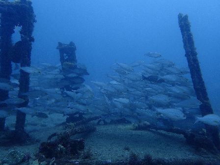 砂地の鉄骨に群がるイサキ