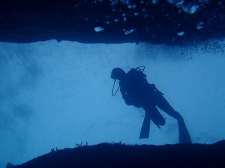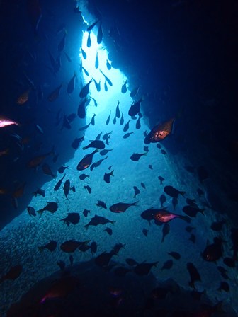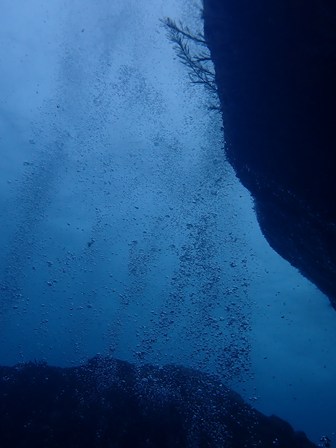 たて穴から上昇するダイバーの泡も、