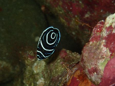 Hの穴の溝にいるタテジマキンチャクダイの幼魚