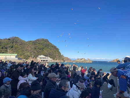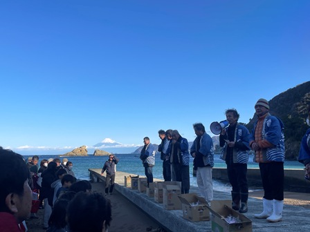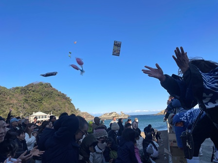 雲見海岸では例年1月2日に一年の安全と豊漁を祈り、お餅やお菓子をまきます。