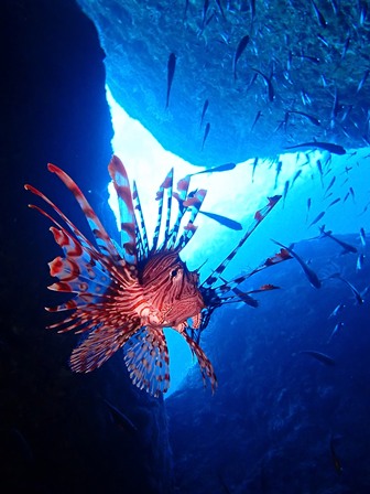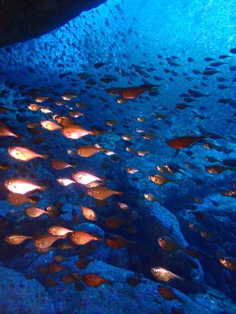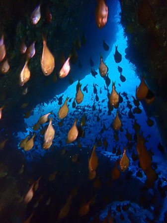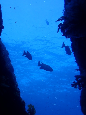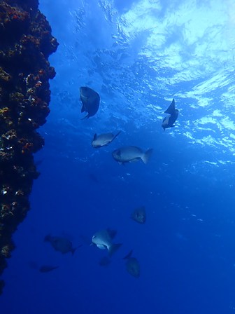 生物:カイメンウミウシ・ヒロウミウシ・ウミシダウバウオ・ガラスハゼ・ハナミノカサゴ・テングダイ・イシガキフグの群れ・イサキの群れ・キビナゴの群れ・ネンブツダイygの群れ・スズメダイの群れ・ソラスズメダイygの群れ・イッセンタカサゴygの群れ・コガネスズメダイの群れ・キンギョハナダイの群れ・オオモンハタの群れ・イスズミの群れ・メジナの群れ・ホウライヒメジの群れ・キンメモドキの群れ・ツマグロハンポの群れ 他