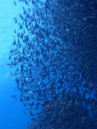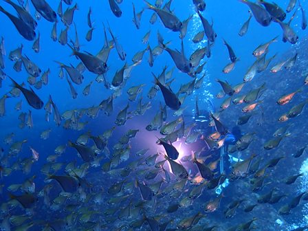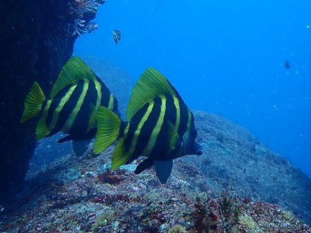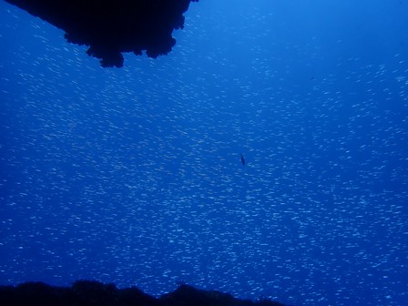 生物:テングダイ・ミヤコウミウシ・トラウツボ・イシガキフグ・コロダイの群れ・タカベの群れ・キビナゴの群れ・ネンブツダイygの群れ・スズメダイの群れ・ソラスズメダイygの群れ・イッセンタカサゴygの群れ・コガネスズメダイの群れ・キンギョハナダイの群れ・オオモンハタの群れ・イスズミの群れ・メジナの群れ・ホウライヒメジの群れ・キンメモドキの群れ・ツマグロハンポの群れ 他